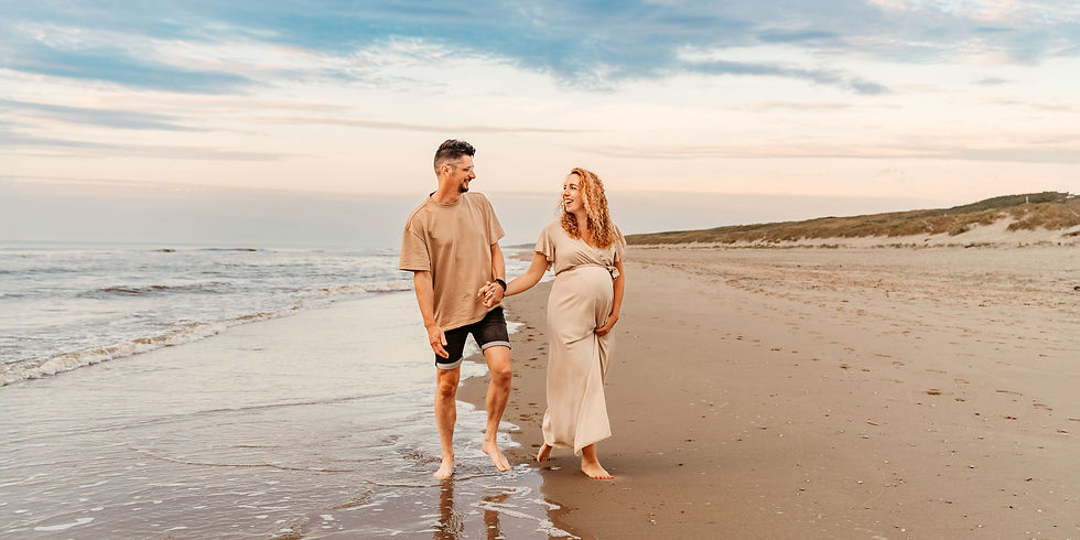 Precies daar ligt de kern van mijn werk. Ik geloof dat de mooiste beelden ontstaan wanneer je jezelf kunt zijn, zonder druk of verwachtingen. Geen stijve poses of onnatuurlijke decors, maar puur de verbinding, de zachtheid, en de anticipatie die nu voelbaar is. Of dat nu thuis is, in een groene oase, of met de wind door je haren op het strand – de locatie kies je, de emotie vangen we.